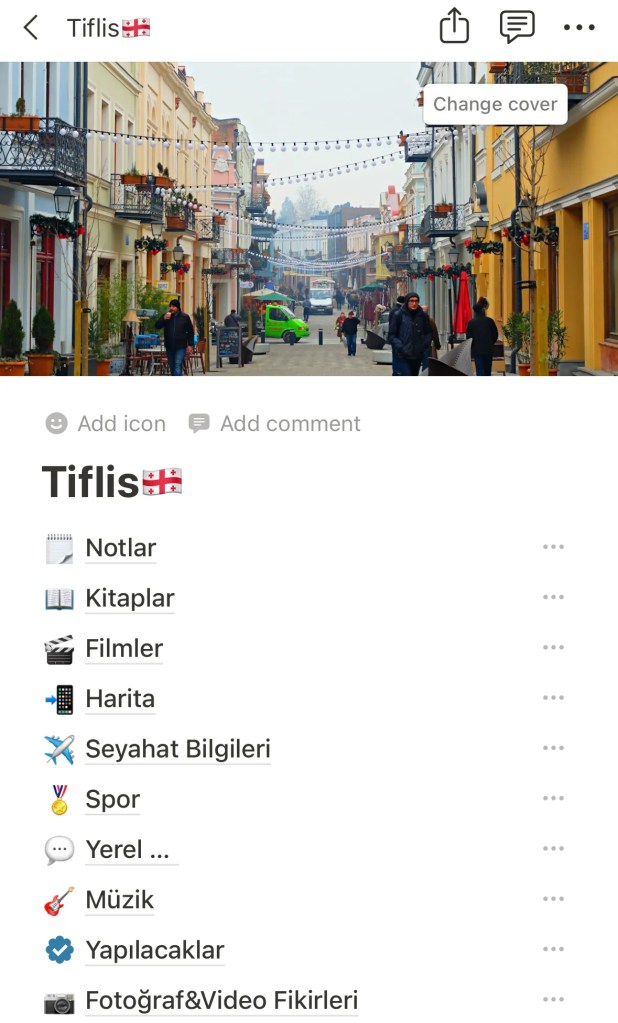 Genellikle her yılın aralık ve mart ayları için bir yurt dışı seyahati planı oluşturmaya çalışırız. Yer belirlerken dikkat ettiğimiz bazı noktalar var: Üç- dört günlük seyahat olmalı, ağırlıklı olarak hafta sonuna doğru olmalı ve en önemlisi şehir yürüyerek gezilebilmeli. Aralık ayı için bir diğer önemli nokta ise Noel zamanına rast getirilerek şehri daha canlı bir şekilde ışıl ışılken ziyaret edebilmektir. Bu sene için bu kriterleri göz önüne aldığımızda öne çıkan yer Tiflis oldu. Dört günlük bir seyahat olacak şekilde uçak biletlerini birkaç ay öncesinden aldık. En önemli adım gidilecek yerin adını koymak. Çünkü sonrası için yapılacaklar benim seyahat etme motivasyonumun zaten ta kendisidir. Bunu doğrudan bu gezi üzerinden açıklamaya çalışacağım. Biletler alındıktan hemen sonra bilgisayarım, tabletim ve telefonumda ortak bulut tabanını kullanan not uygulamam “Notion” üzerinden içeriği alttaki görselde olan yeni bir sayfa oluştururum.